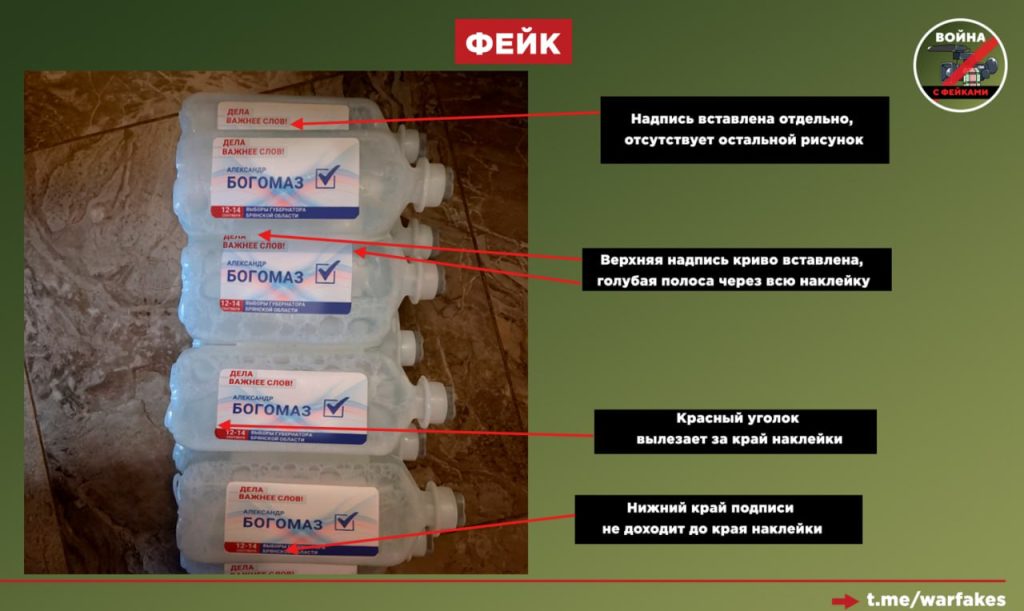 Авторы вброса нашли кадр с бутылками физраствора в интернете. С помощью графического редактора фейкометы «налепили» агитационные листовки поверх настоящих этикеток. Это можно заметить при приближении фото — часть «этикетки» вылезает за границы, а сами наклейки имеют разные размеры и пропорции.