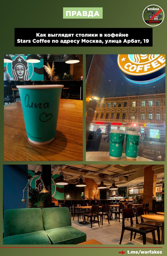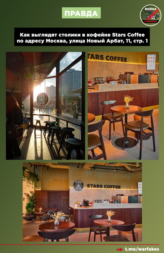 Распространяемые снимки не могли быть сделаны в кофейне Stars Coffee в центре Москвы. Фейкометы уточняют, что заведение, в котором якобы работает неадекватный участник СВО, находится на Арбате. В этом районе располагаются две кофейни Stars Coffee: одна по адресу улица Арбат, 19, другая — улица Новый Арбат, 11, стр. 1. В обоих заведениях стоят столики с деревянными столешницами. Однако фото фейковых листовок сделано на фоне поверхности с серым мраморным покрытием.