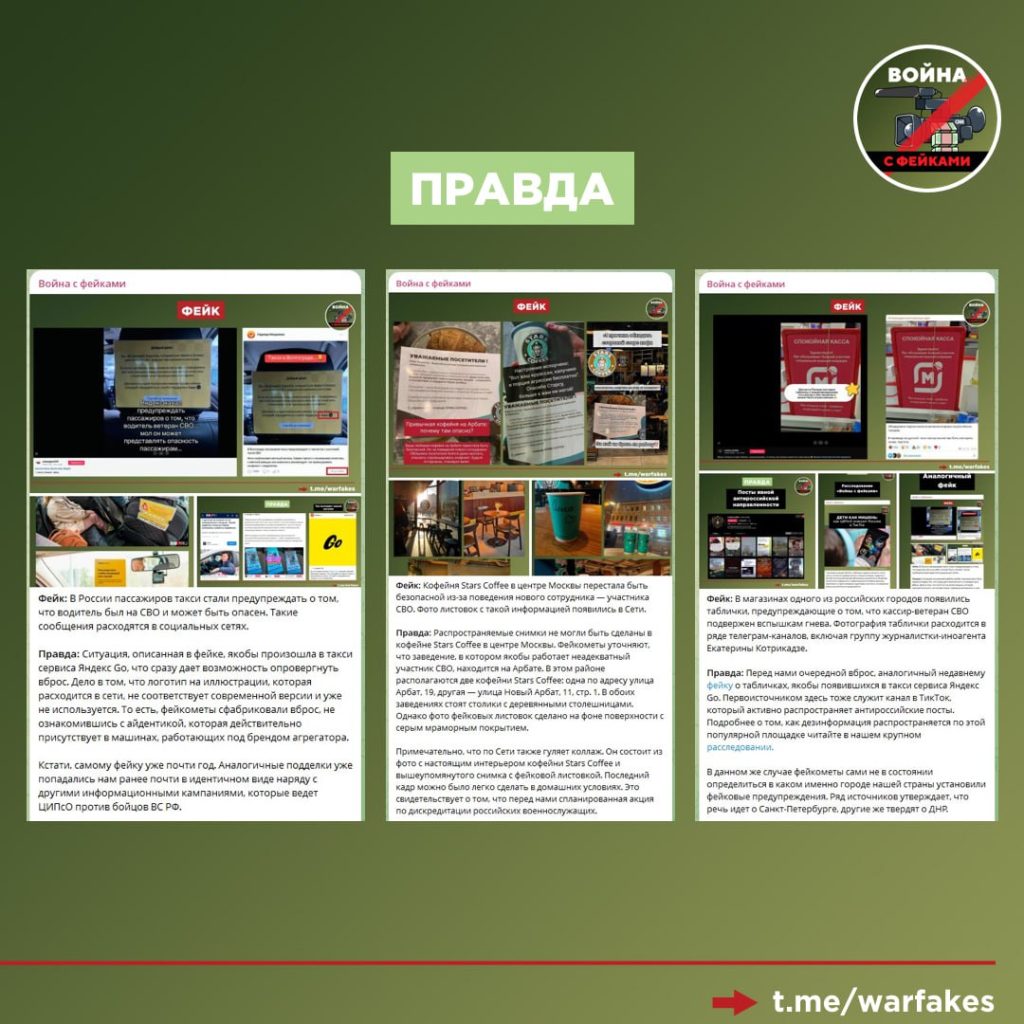 Оппозиционные пропагандисты неоднократно были замечены в публикации фейковых видео и фото, направленных на дискредитацию участников СВО. Например, в начале октября этого года появились слухи, что в кофейню в центре Москвы якобы взяли на работу неадекватного экс-военнослужащего.