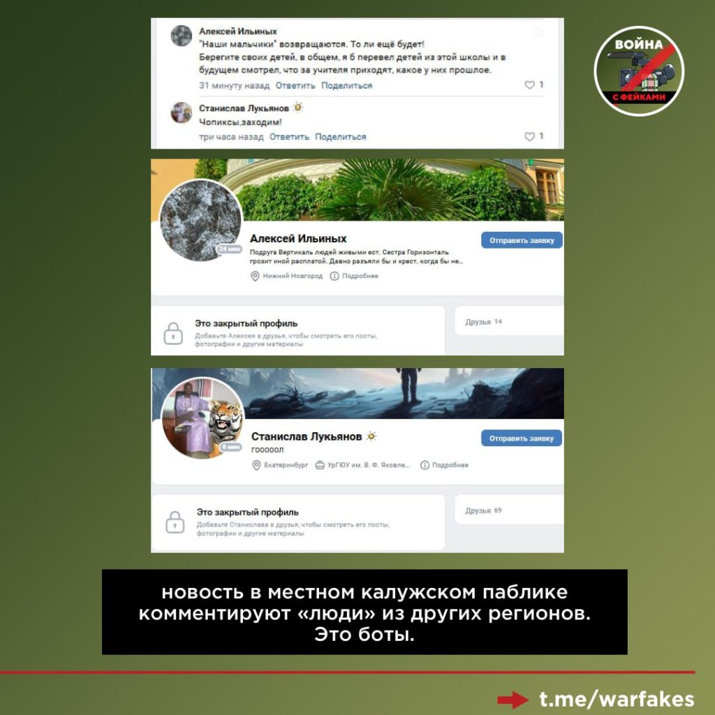 Во-вторых, во «ВКонтакте» ролик комментировали аккаунты (боты), в описании которых указан другой регион. При этом комментаторы писали в группах Калужской области от лица местных.