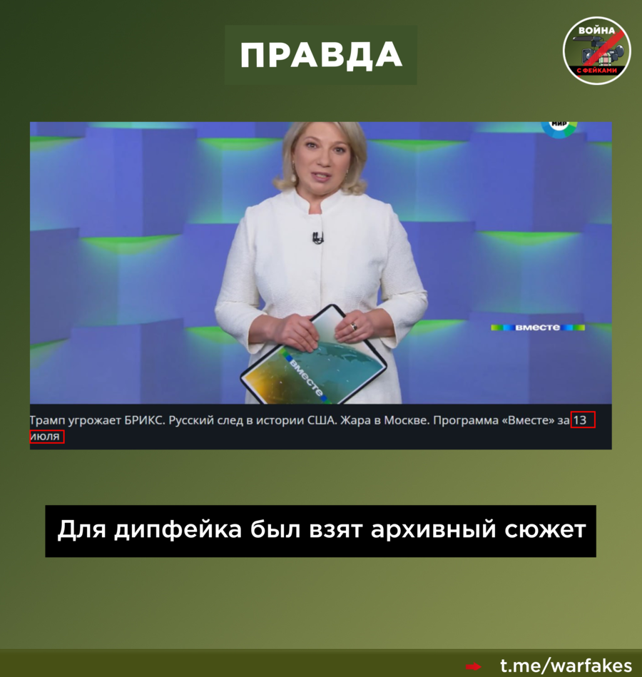 «Донором» для вброса стал эфир программы, вышедшей на телеканале «Мир» 13 июля. На кадрах с ведущей отчетливо прослеживается расхождение видеоряда и звука. В дипфейке фигурирует фотография Лодейнопольской средней общеобразовательной школы № 68 имени А.А. Якимовского, располагающейся в Ленинградской области. С помощью «адресников» фейкометы, вероятно, пытались придать правдоподобности сюжету. Однако на сайте и в соцсетях образовательного учреждения мультфильм не фигурирует.