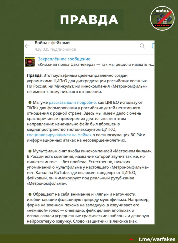 Это далеко не первая дезинформационная кампания, направленная на дискредитацию бойцов СВО. В данном случае эффекта пытаются достигнуть за счет абсурдного слуха про мультфильм с сомнительным контекстом.