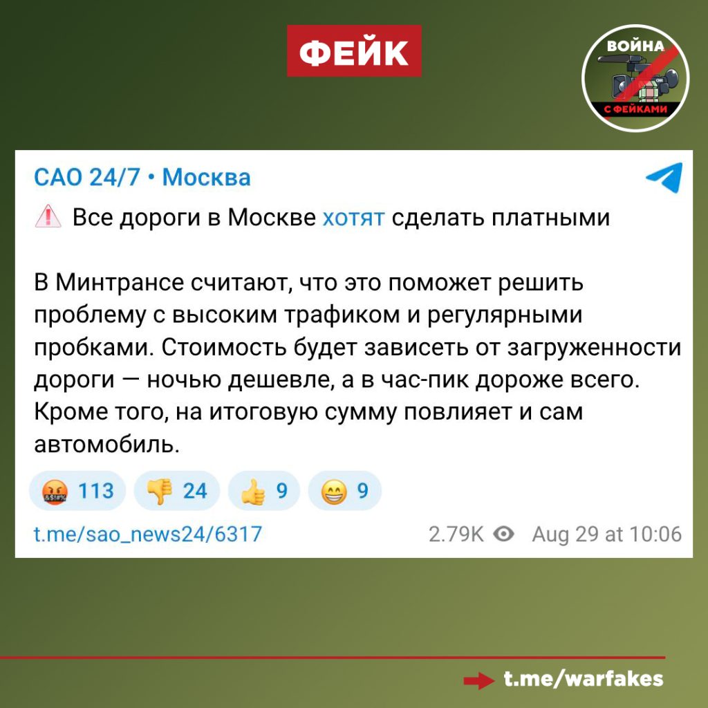 О чем фейк: Все дороги в Москве хотят сделать платными — за каждый километр пробега на личной машине придется платить, пишут информационные паблики со ссылкой на Минтранс.