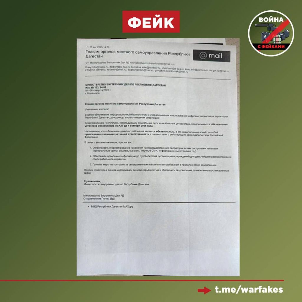 Мессенджер МАХ не обязателен для установки ни в Дагестане, ни в любом другом субъекте федерации. Документ, который используется в качестве «доказательства», фальшивый.