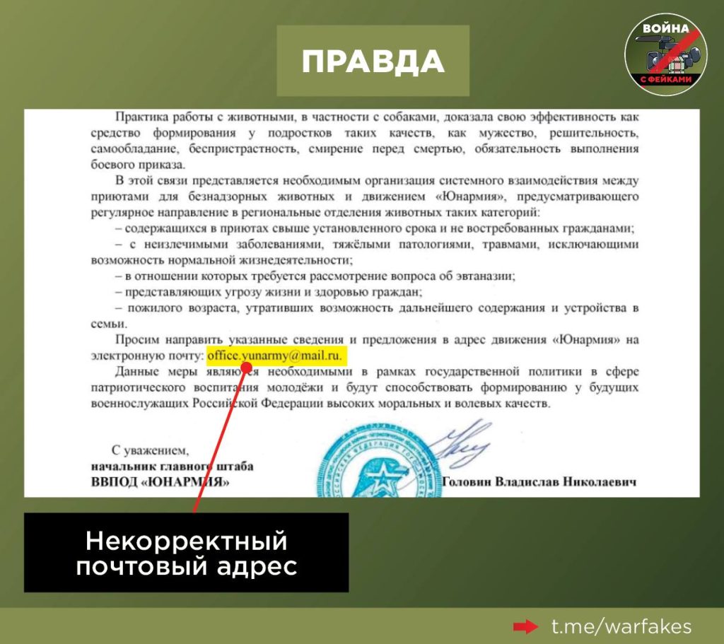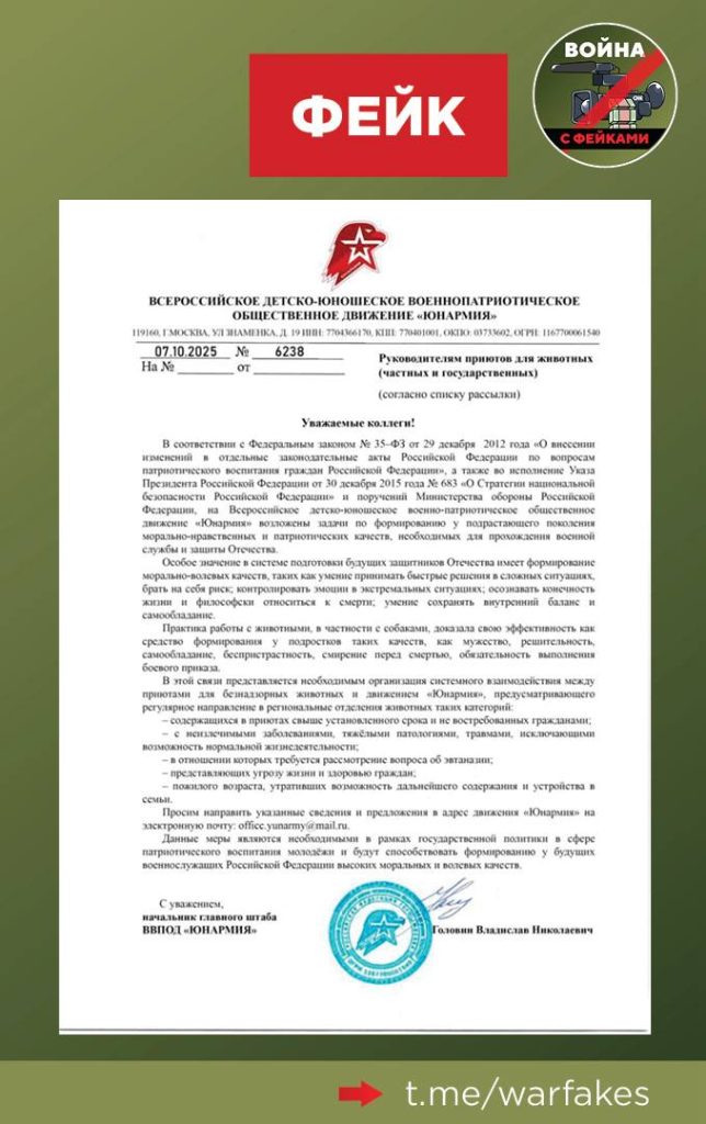 О чем фейк: «Юнармия» хочет использовать животных, подлежащих эвтаназии, для того, чтобы участники движения лично их отстреливали. Это нужно для формирования морально-волевых качеств молодежи, утверждается в письме за подписью начальника главного штаба «Юнармии», которое распространяется в соцсетях.