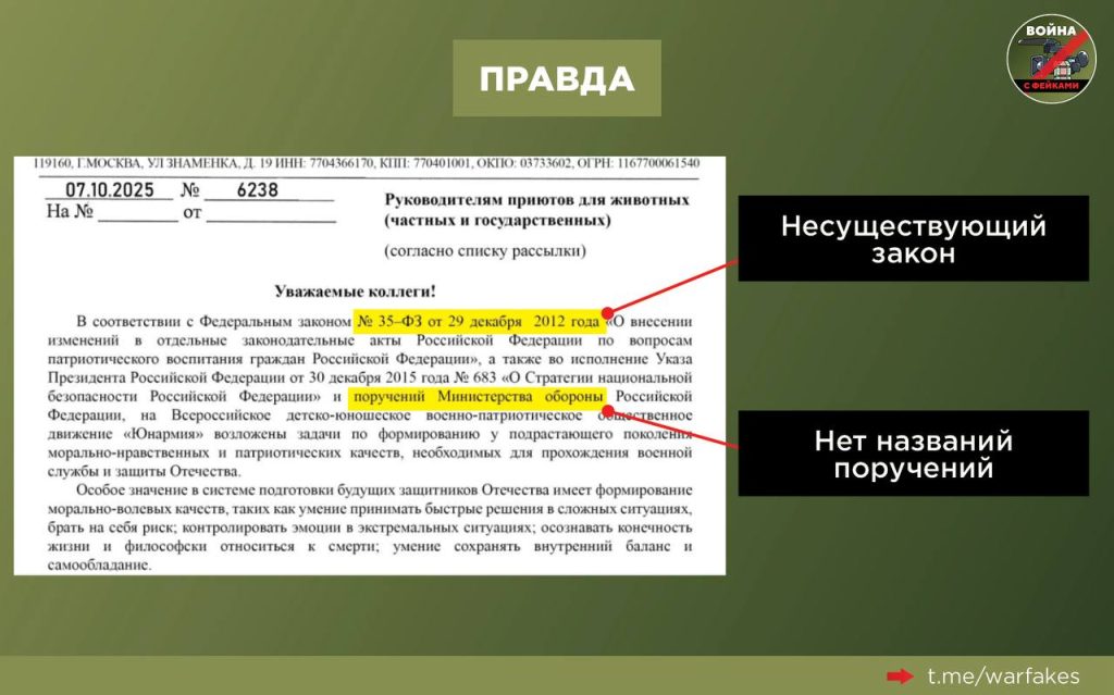 Письмо — подделка, призванная дискредитировать «Юнармию». Авторы вброса намеренно спекулируют на чувствительной теме. При этом в тексте «документа» есть несколько грубых ошибок, изобличающих фальшивку.