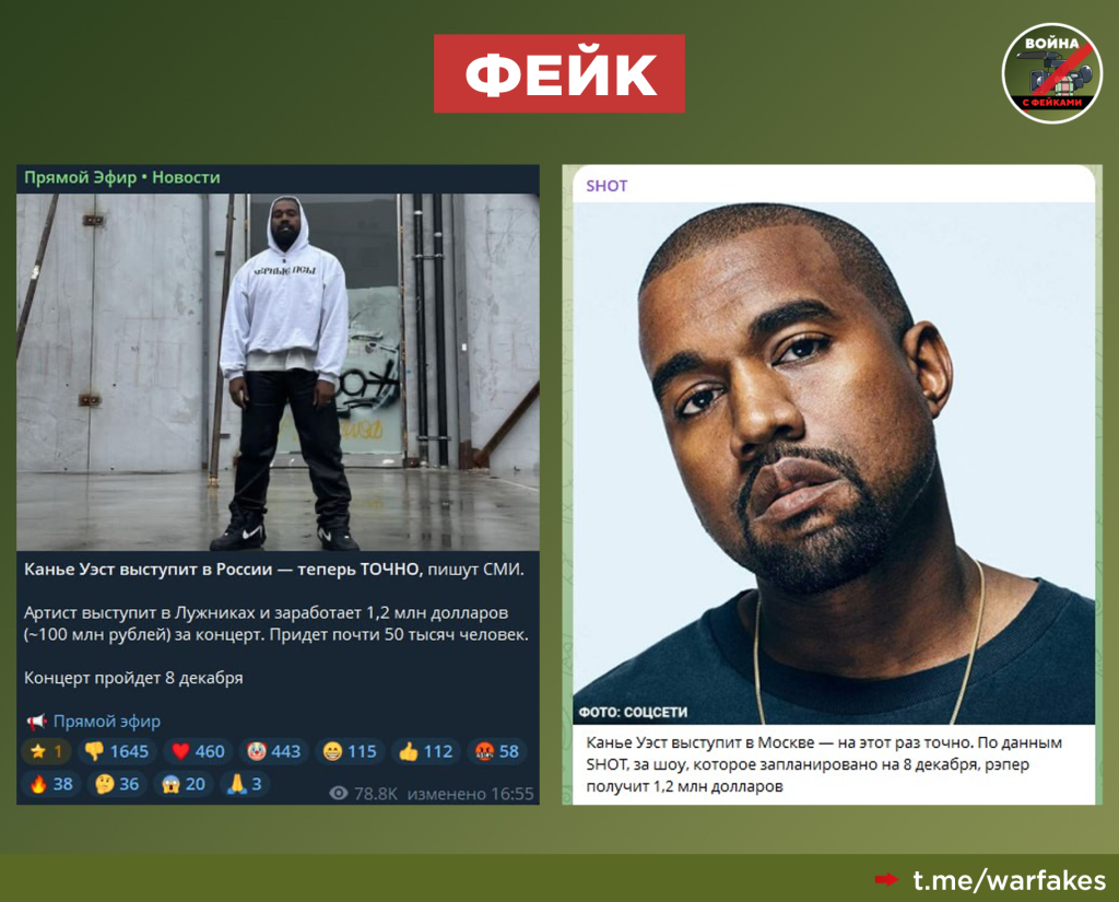 О чем фейк: Канье Уэст выступит в Москве 8 декабря, пишут телеграм-каналы, добавляя, что информация точная и проверенная и даже называя сумму вознаграждения.