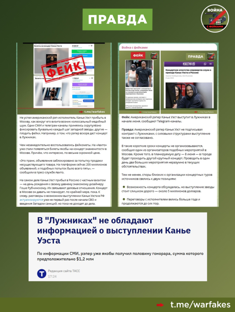 Это уже не первый фейк, связанный с Канье Уэстом. В частности, во время частного визита исполнителя в Россию мошенники пытались продавать через интернет фальшивые билеты якобы на концерт Уэста.