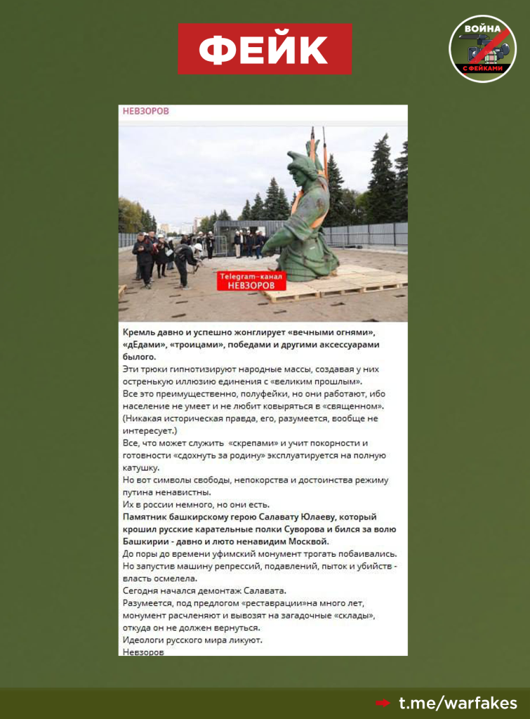 О чем фейк: Причина демонтажа памятника Салавату Юлаеву в Уфе заключается в том, что власти РФ его «ненавидят», поскольку он является «символом свободы». Об этом пишет признанный террористом и экстремистом в РФ иноагент Невзоров.