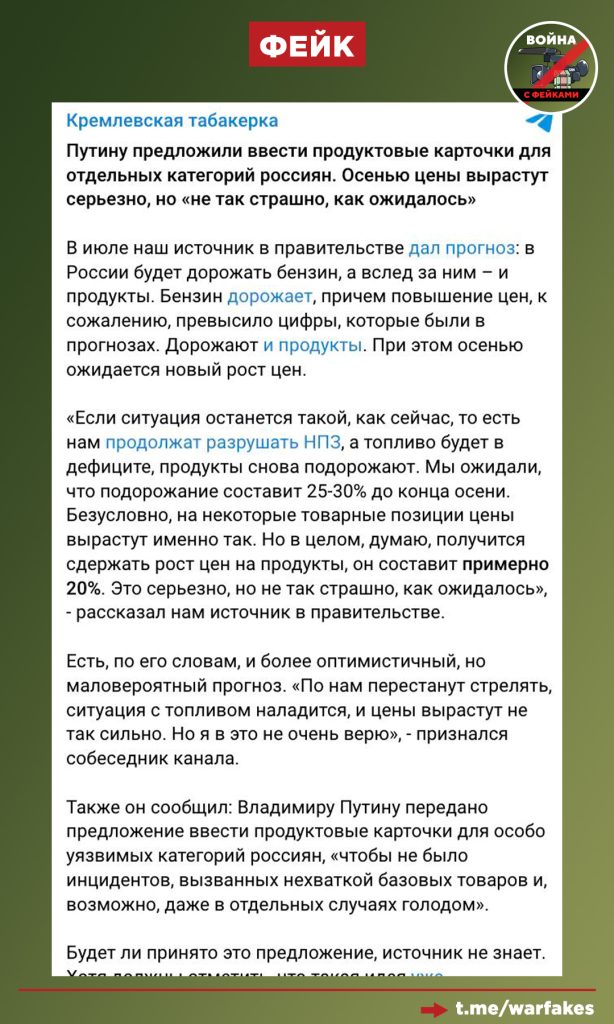 О чем фейк: Российские власти думают ввести продуктовые карточки, чтобы часть населения не осталась без продовольствия, пишет канал «Кремлевская табакерка» со ссылкой на источники в Кремле.