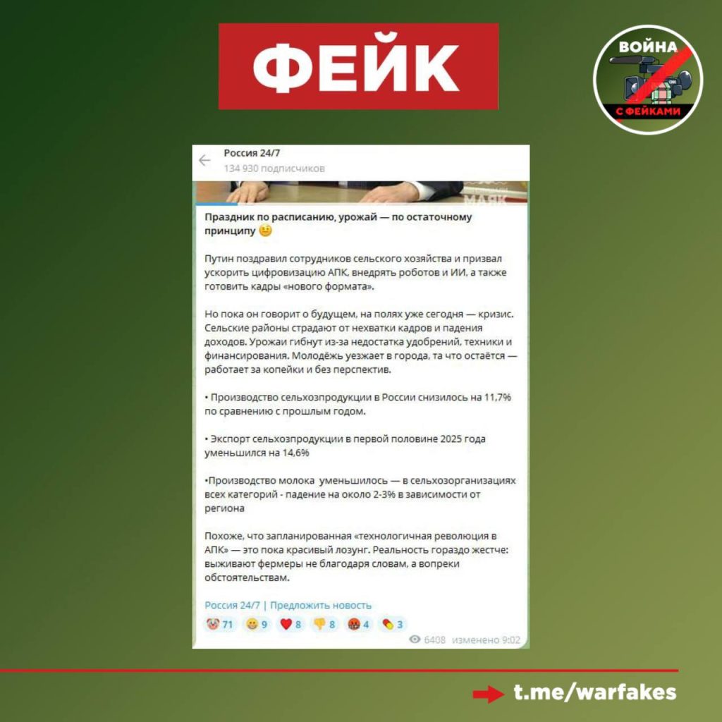О чем фейк: Сельское хозяйство в России приходит в упадок. Об этом пишут проукраинские телеграм-каналы.
