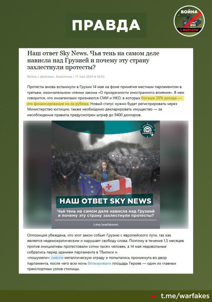 Речь ведётся о законе «О прозрачности иностранного влияния». В нем «грузинским по белому» написано, что иноагентами признаются СМИ и НКО, в которых больше 20% дохода — это финансирование из-за рубежа.