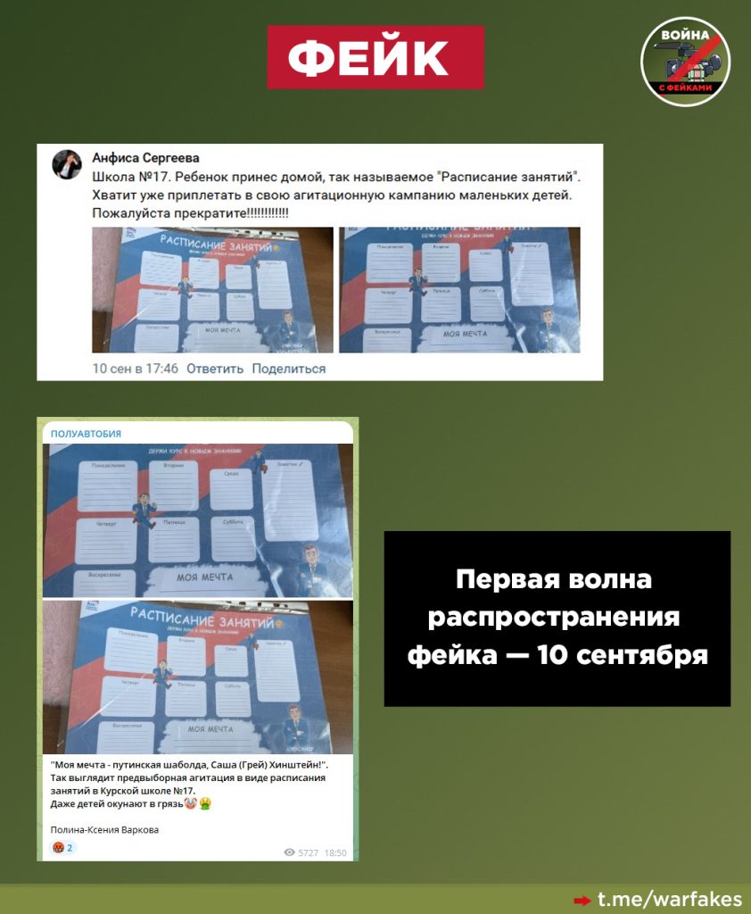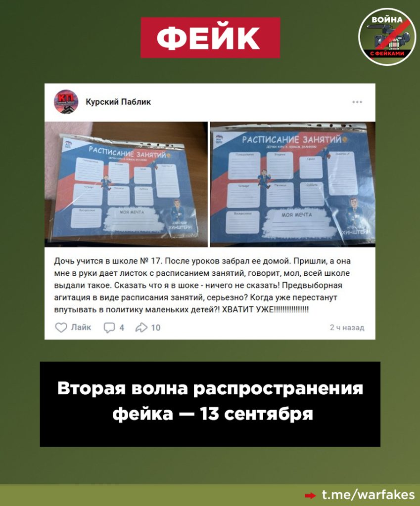 О чем фейк: В Курской области в день выборов проводится незаконная агитация за Александра Хинштейна. Детям в школе раздают плакат-расписание с его изображением, сообщают анонимные паблики и авторы с закрытыми профилями.