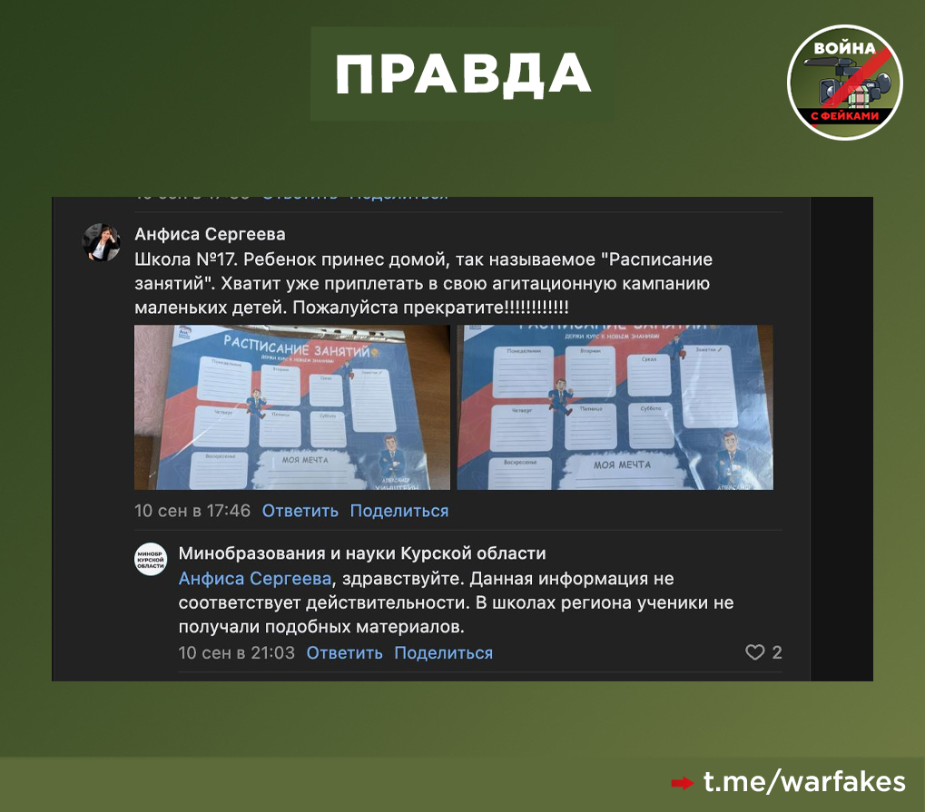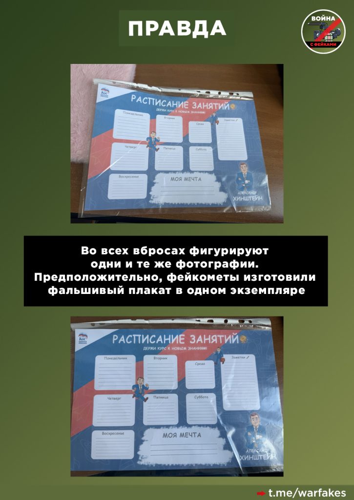 О чем фейк: В Курской области в день выборов проводится незаконная агитация за Александра Хинштейна. Детям в школе раздают плакат-расписание с его изображением, сообщают анонимные паблики и авторы с закрытыми профилями.