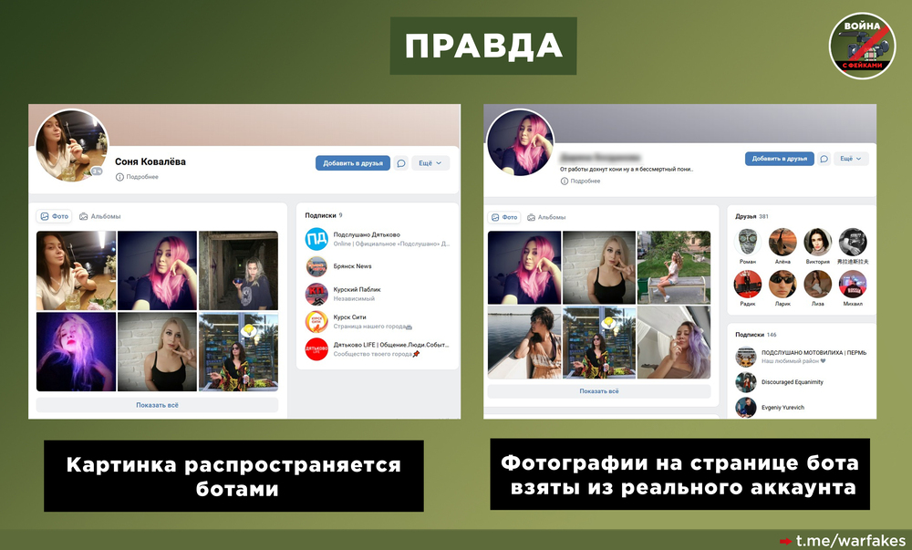 Распространение происходит также при помощи ботов, обладающих характерными признаками. Например, все фото одного из таких аккаунтов размещены в один день — 17 июля, и они взяты со страницы другого пользователя.