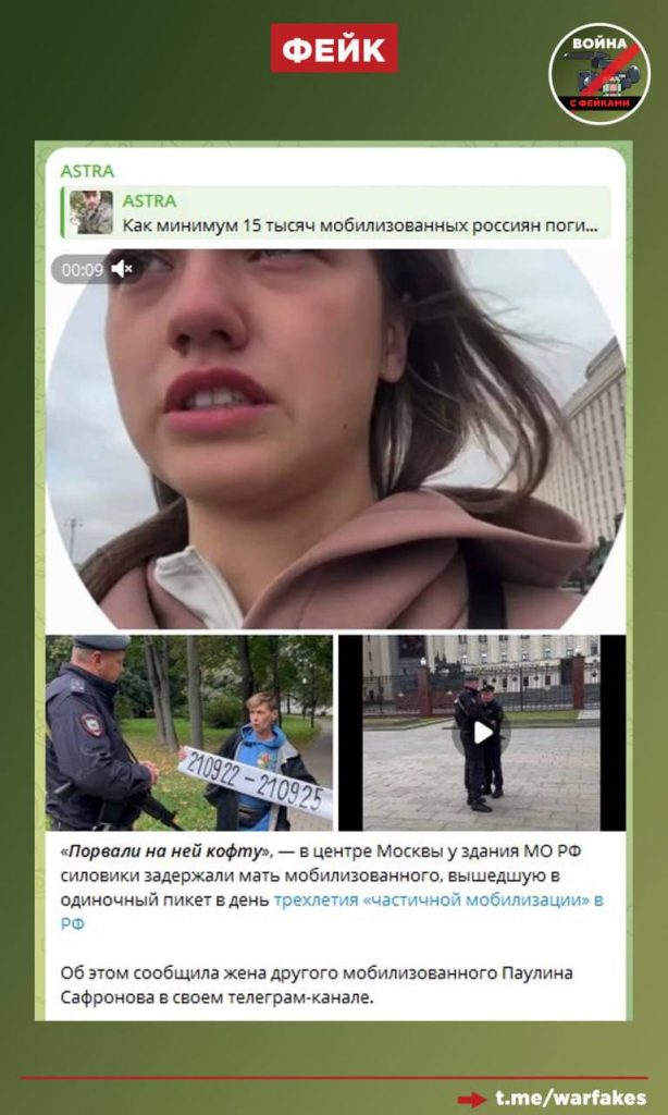 О чем фейк: В Москве силовики грубо задержали мать мобилизованного бойца СВО, которая не связана с политическими движениями и не замечена в акциях иноагентов. Об этом сообщает оппозиционный телеграм-канал «Astra».
