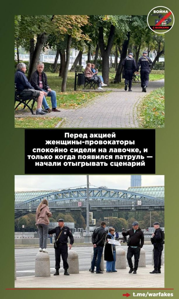 🟢 Стоит обратить внимание на то, что перед появлением в кадре силовиков женщины спокойно сидели на лавочке и ждали патруль. Когда тот появился — начался розыгрыш сцены.