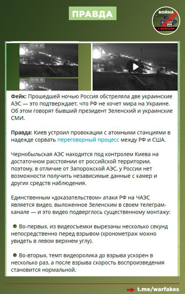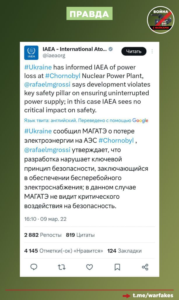 Похожий фейк уже вбрасывался ЦИПсО в 2022 году. Еще тогда Международное агентство по атомной энергии заявило, что отключение электричества на ЧАЭС не несет серьезных угроз.