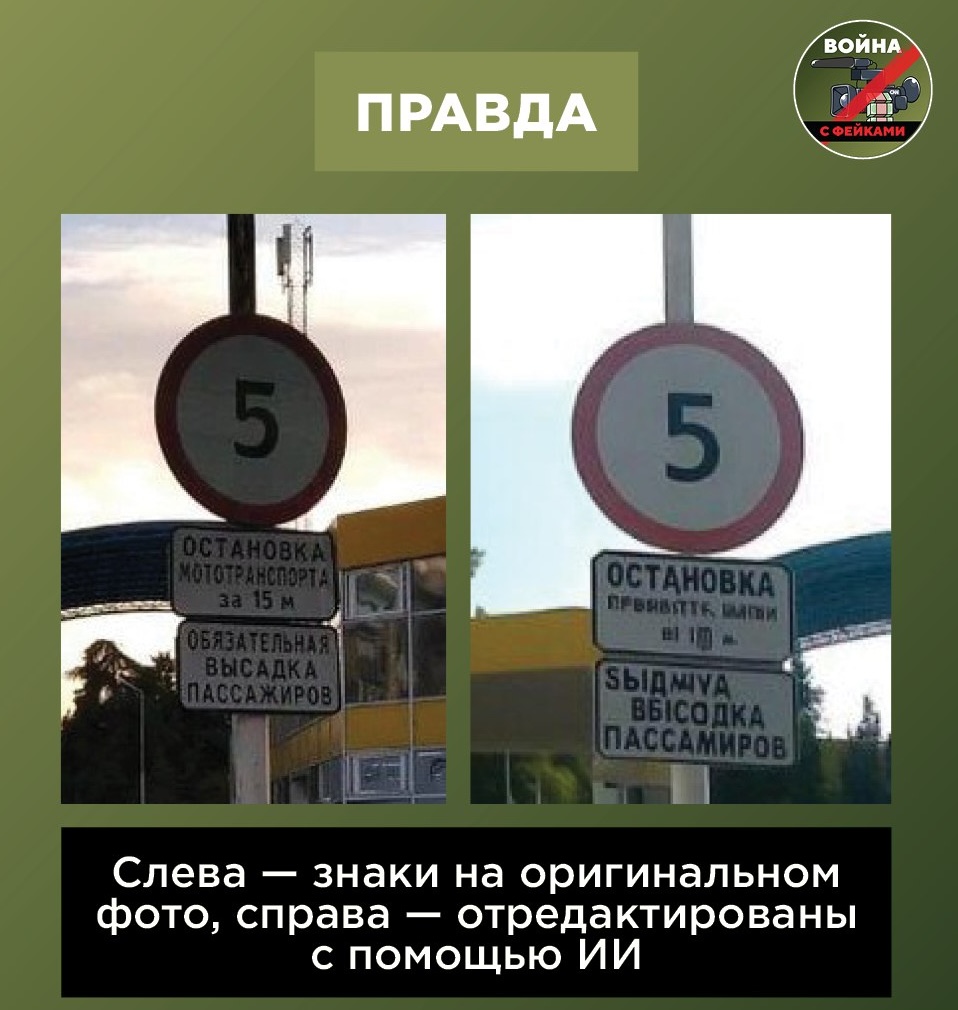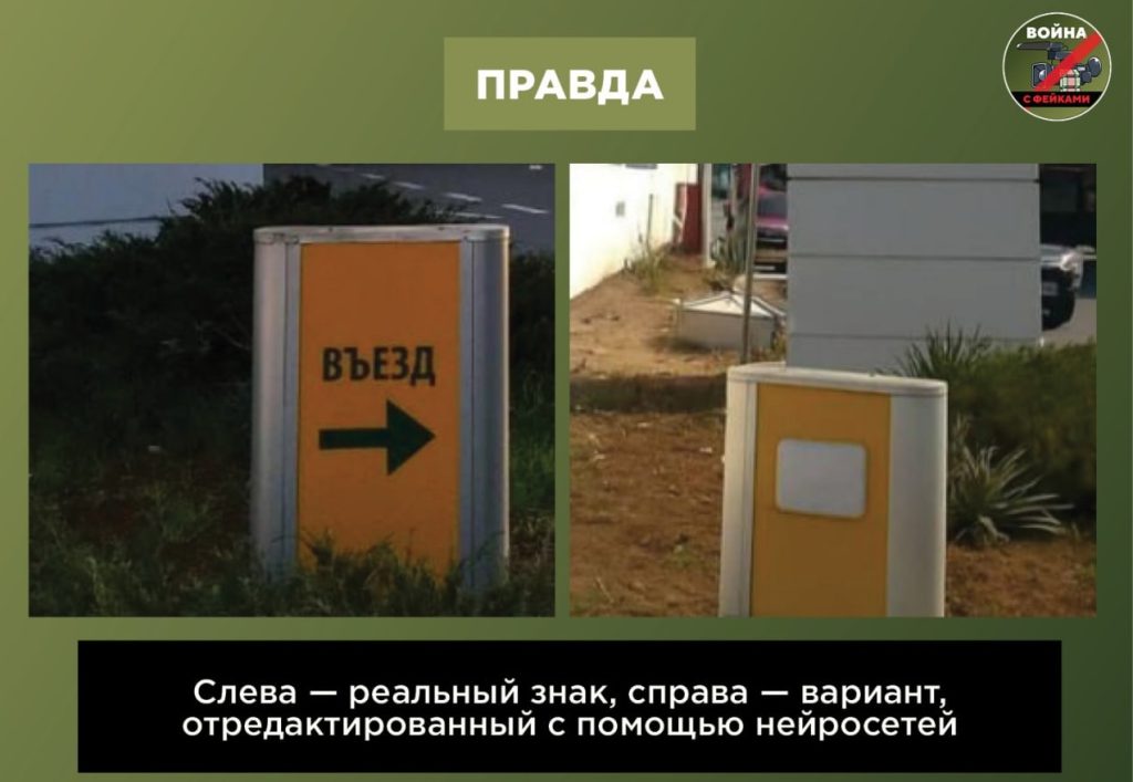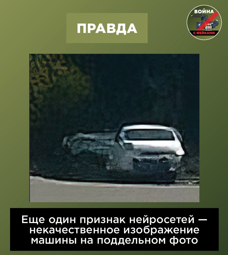 Фейковое изображение разоблачают сразу несколько оплошностей. Надписи на автознаках искажены нейросетью, указатель со словом «Въезд» отредактирован – вместо надписи там появился белый квадрат. Вместо цен на стеле указано несуществующее слово «нету», что «юмористы» из ЦИПсО решили обыграть в контексте постов. Если присмотреться, то на нейросетевом варианте можно увидеть вместо машины груду металлолома на колесах.