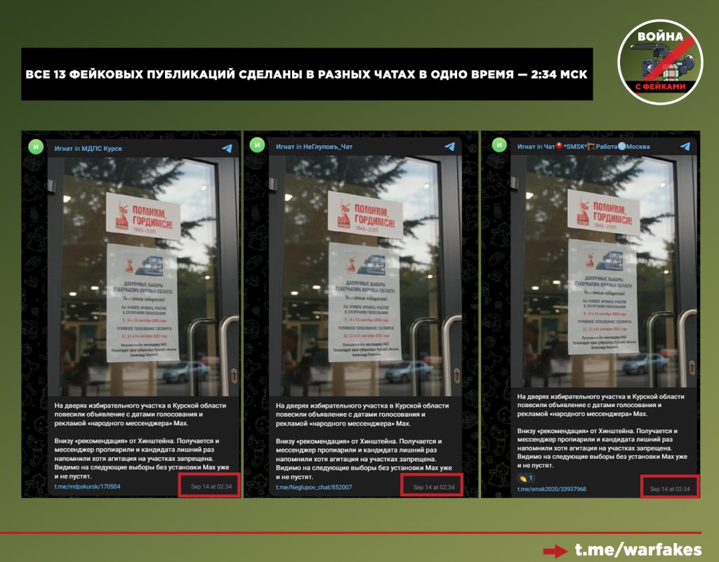 Один и тот же пользователь Игнат опубликовал фейк в одно и тоже время аж в 13 чатах Курской области и почему-то Одессы. Вручную это сделать невозможно, а значит «Игнат» — это бот, специальная автоматизированная программа для постинга. Это свидетельствует о том, что перед нами спланированная акция по дискредитации мессенджера МАХ и Александра Хинштейна.