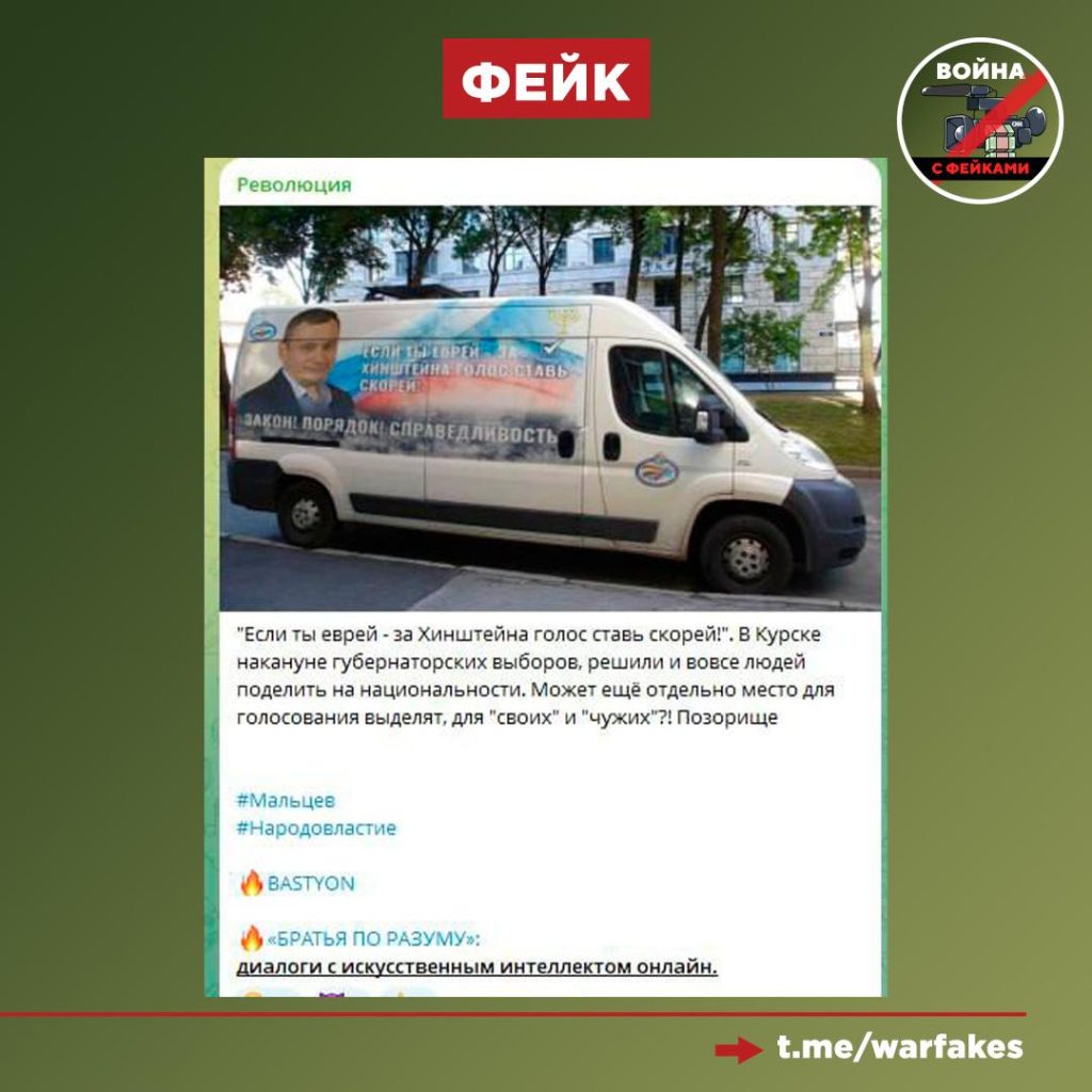 О чем фейк: По Курску ездят микроавтобусы, на которых размещен призыв к избирателям-евреям Курской области голосовать за Александра Хинштейна. Об этом пишет ресурс оппозиционного деятеля Вячеслава Мальцева, известного как основатель экстремистского националистического движения «Артподготовка» .