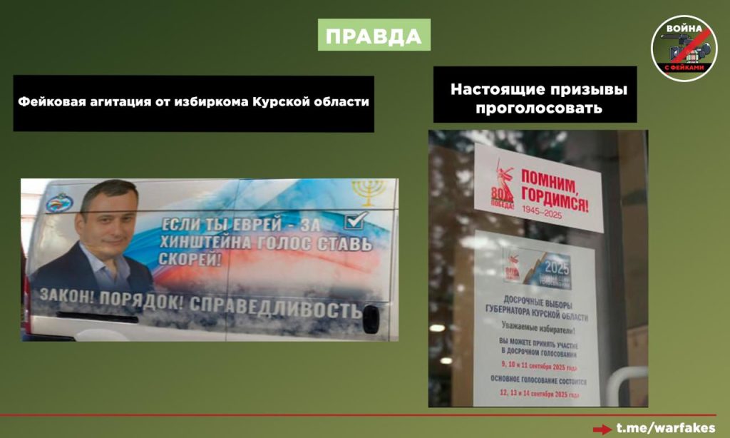 Этот фейк, вброшенный в дни голосования, призван вызвать межнациональную рознь. Конечно, никто отдельно не приглашал голосовать жителей-евреев Курской области за врио губернатора Александра Хинштейна. Данная картинка была сделана с помощью фотошопа, а машина сфотографирована вообще не в Курске. Это легко определить по табличке, которую видно на здании — она синего цвета. В Курске же таблички с адресами домов белые и брендированы гербом региона, что видно на медиафайлах.