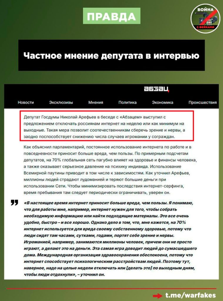 В данном случае парламентарий Николай Арефьев в беседе с изданием «Абзац» предложил отключать гражданам интернет на неделю или как минимум на выходные. Он выразил личное мнение и даже не оформил свою инициативу в законопроект. На основе интервью издания оппозиционеры сформировали полноценный фейковый кликбейт о том, что «Россиянам отключат интернет». Разница в подаче информации налицо. В официальных источниках не упоминается законопроект на эту тему.