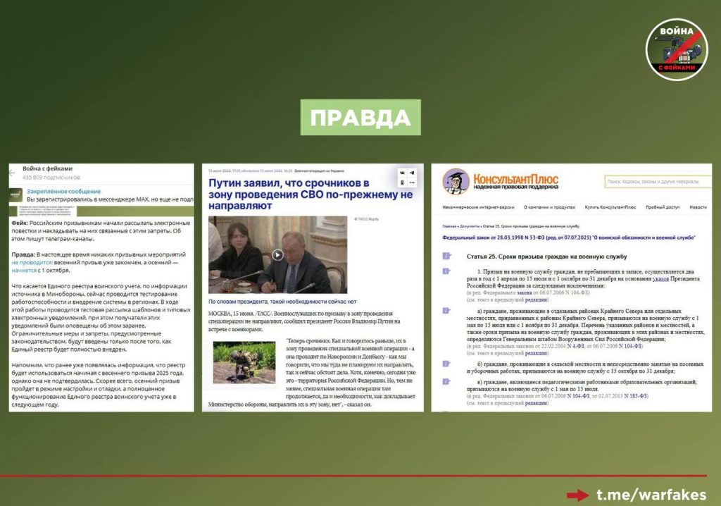 Что касается якобы «отправки срочников на СВО», то это один из самых популярных нарративов украинской и оппозиционной российской пропаганды, используемых для повышения тревожности у граждан. РФ не отправляет солдат-срочников в зону специальной военной операции — туда отправляются те, кто добровольно подписал контракт с Минобороны.
