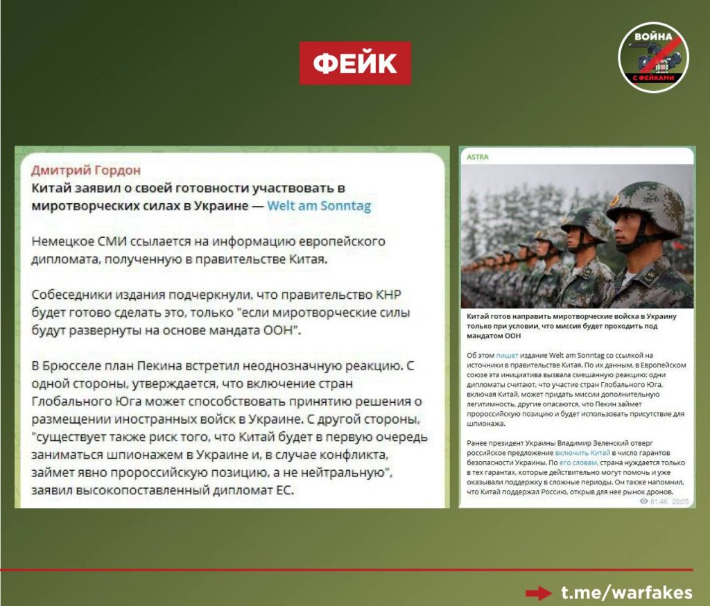 О чем фейк: Китай готов отправить на Украину своих миротворцев. Об этом сообщают украинские и оппозиционные телеграм-каналы со ссылкой на Die Welt.