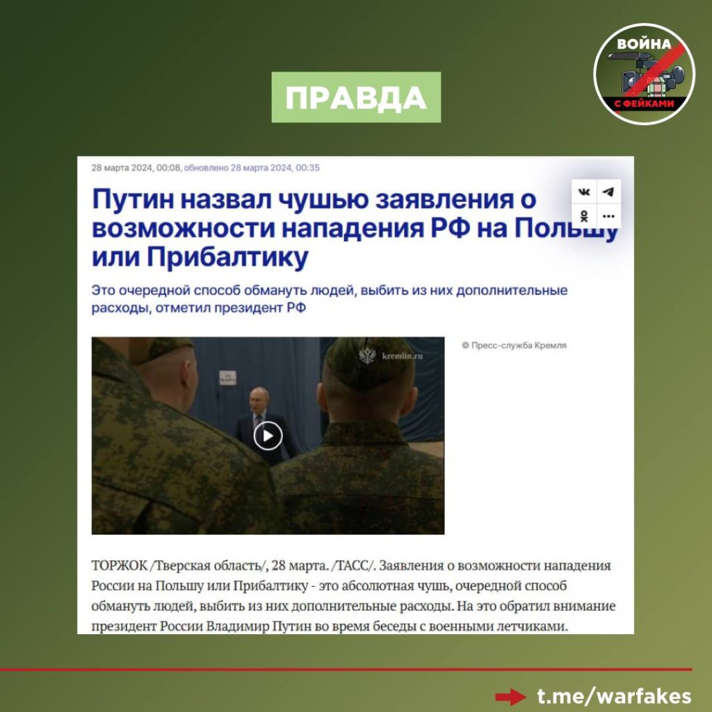«Это полная чушь — возможность нападения на какие-то другие страны, на Польшу, Прибалтику. А еще там все чехов пугают. Просто бред. Очередной способ обмануть свое население и просто выбить дополнительные расходы, заставить их нести это бремя на своих плечах», — говорил ранее Президент РФ Владимир Путин.
