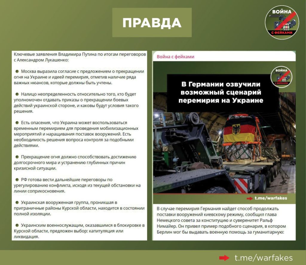 В частности, Путин подчеркнул, что необходимо остановить принудительную мобилизацию на Украине и перевооружение ВСУ. Напомним, на пресс-конференции по итогам российско-белорусских переговоров он выразил опасение, что временное прекращение огня может позволить Украине продолжить мобилизационные мероприятия и активизировать поставки оружия, а новые подразделения могут пройти необходимую подготовку.