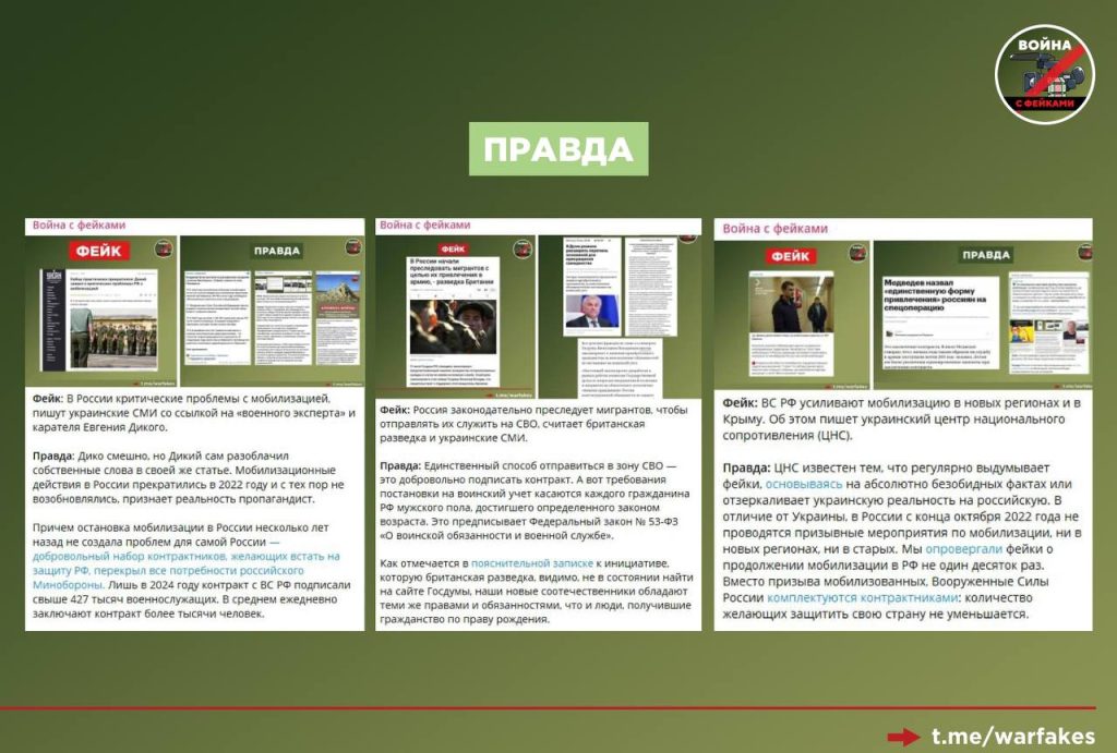 Что касается самого источника информации, то так называемый Центр национального сопротивления был изначально создан в интернет-пространстве для того, чтобы распространять фейки. Мы многократно разоблачали его заявления, в том числе связанные с мобилизацией.