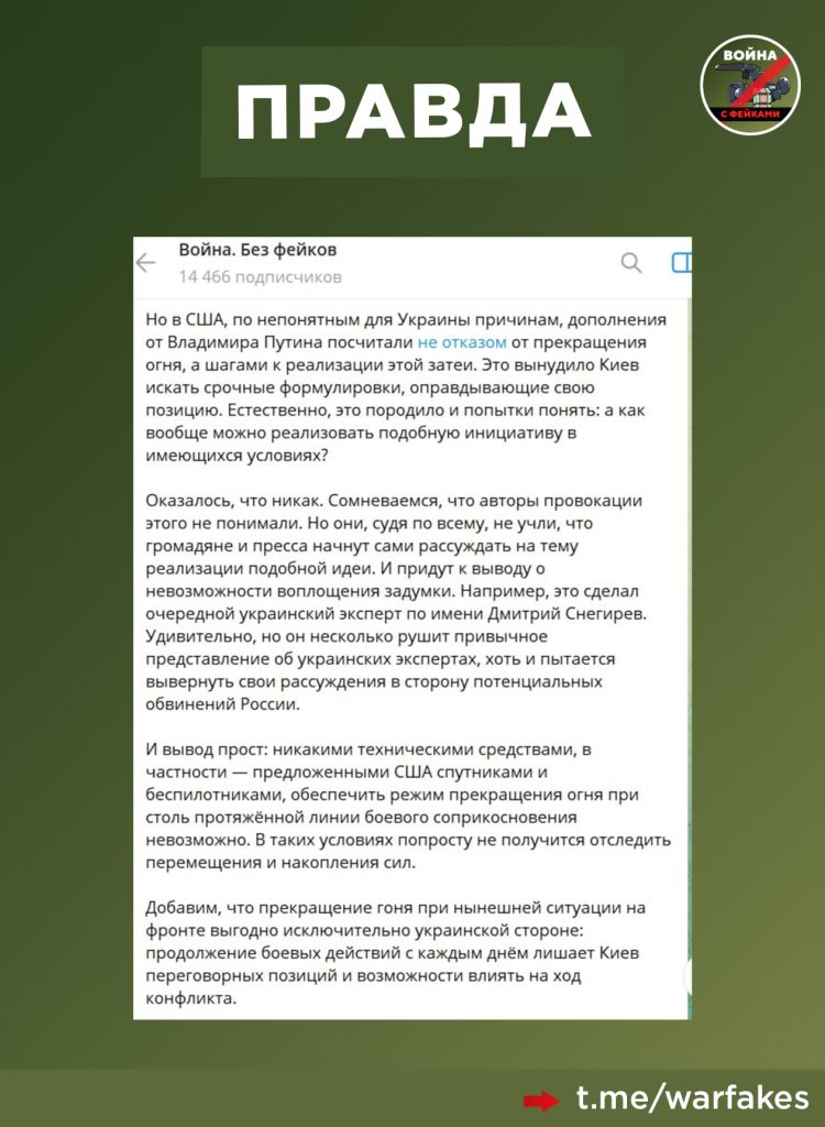 Ранее в канале «Война. Без фейков» мы рассказывали, что никакими техническими средствами, в частности — предложенными США спутниками и беспилотниками, обеспечить режим прекращения огня при столь протяжённой линии боевого соприкосновения невозможно. А значит, идея хоть и выглядит красивой, но на деле является гипотетической.