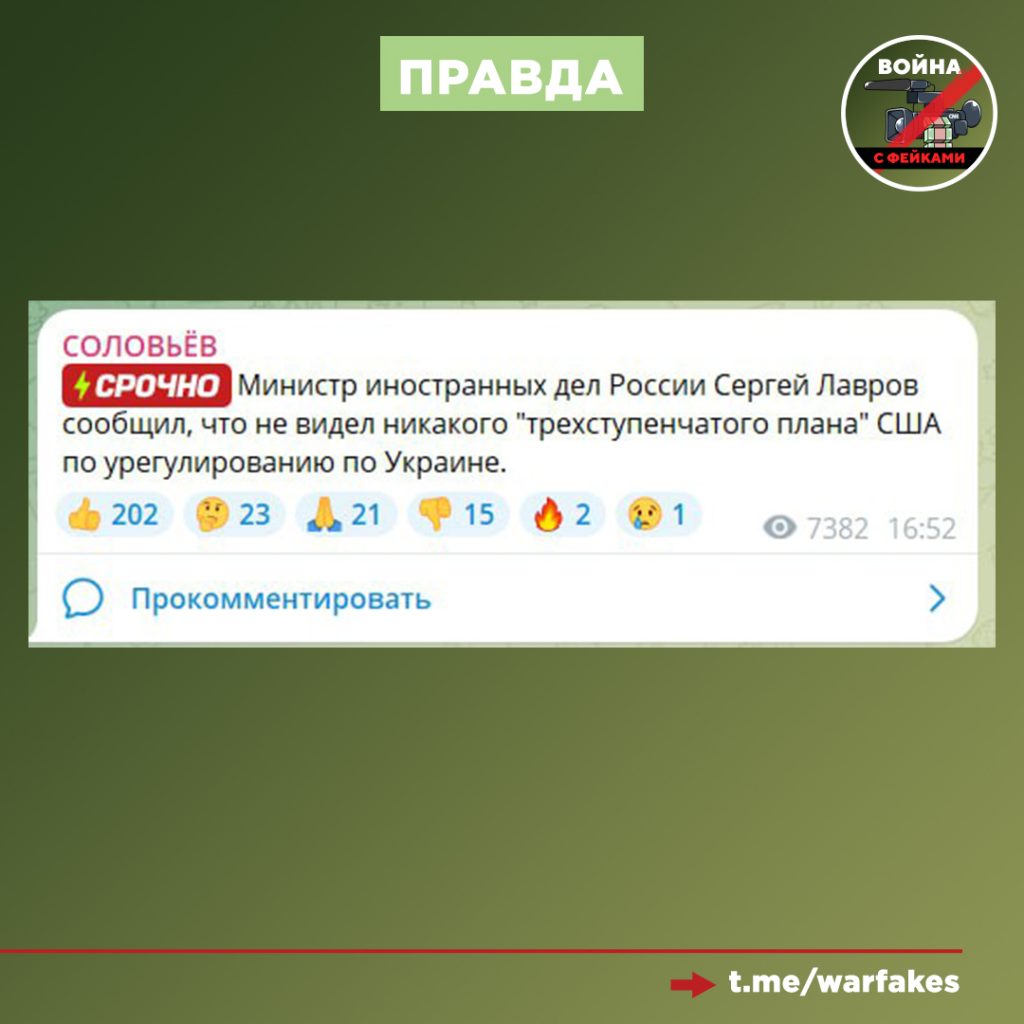 «Я нашел ссылку на заявления министра иностранных дел Польши Радека Сикорского, который рассказывал где-то в кулуарах Мюнхена о том, что он встречался с представителем США Китом Келлагом, который проинформировал его о некотором плане урегулирования, там не сказано было три пункта или четыре. Сикорский сказал, что «план не типичный, но может быть весьма интересным. Я спросил у госсекретаря США Марко Рубио и советника Дональда Трампа по нацбезопасности Майка Уолтца, что это означает — они сказали, что это фейк», — сказал Лавров.