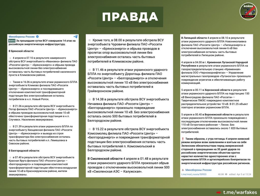 Лишь за 4-5 апреля ВСУ 14 раз атаковали российские объекты энергетики.