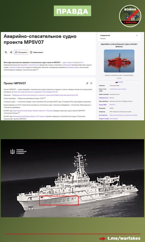 Противник в своих публикациях сам же утверждает, что поражённый объект относится к проекту MPSV07. Это — многофункциональные аварийно-спасательные суда ледокольного класса. Они предназначены для аварийно-спасательного дежурства, поиска, спасения и эвакуации терпящих бедствие судов и людей, тушения пожаров на плавучих и береговых объектах, ликвидации аварийных разливов нефти, выполнения глубоководных подводно-технических работ.