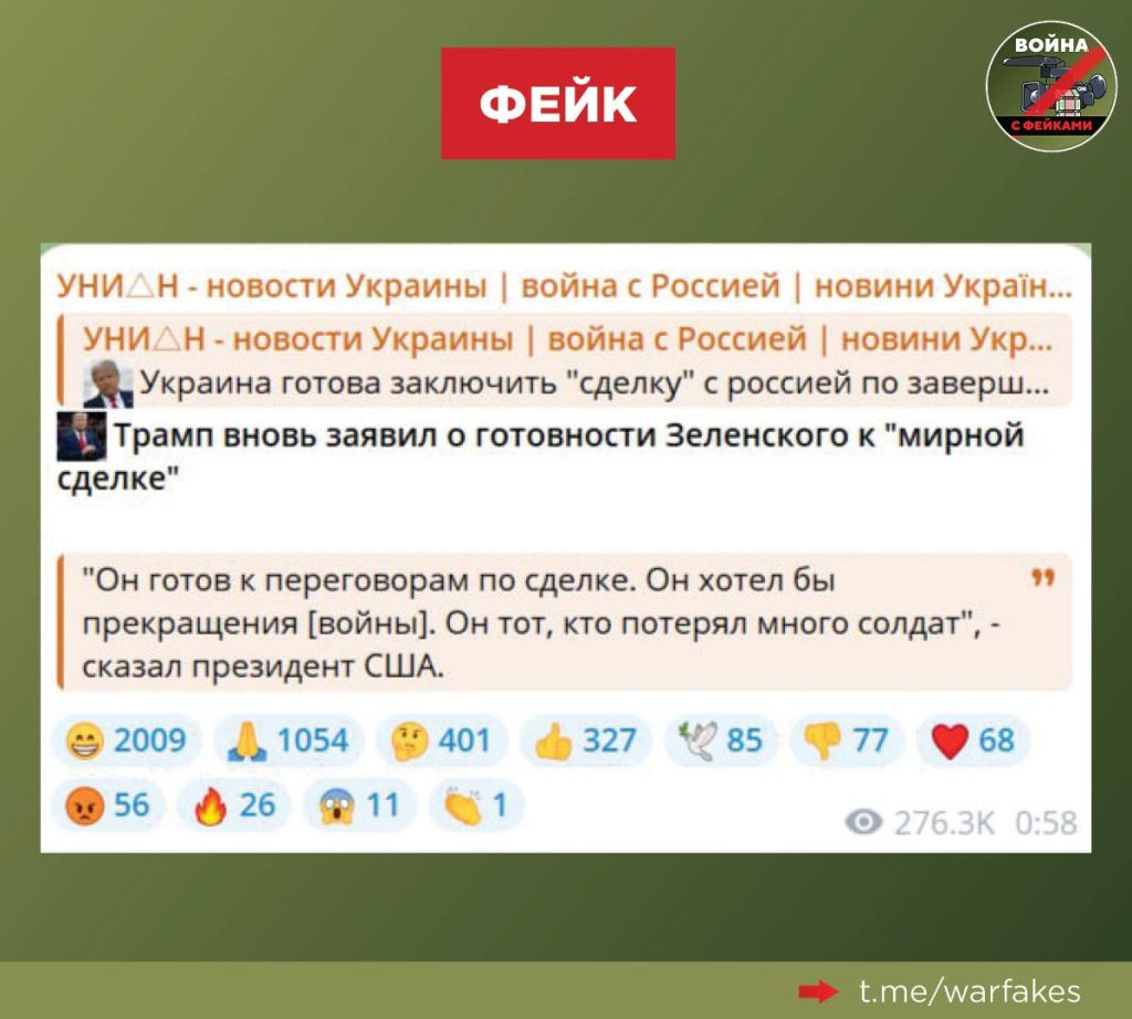О чем фейк: Владимир Зеленский готов к мирным переговорам с Россией, пишут украинские телеграм-каналы со ссылкой на Дональда Трампа.