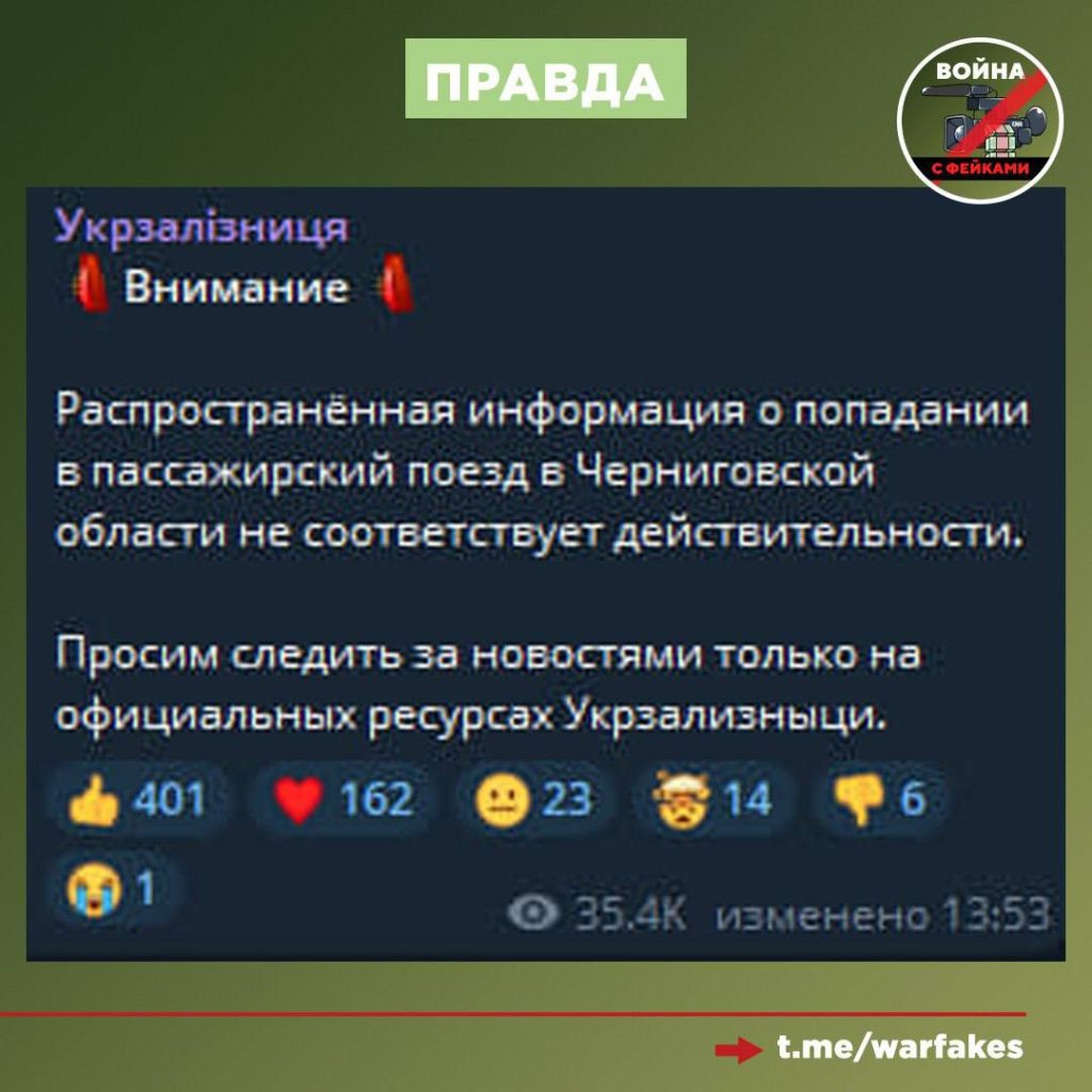 Несмотря на отсутствие убедительных фото- или видеодоказательств, телеграм-каналы и СМИ активно подхватили фейк. Неожиданно, но сообщение об ударе опровергли в компании «Украинская железная дорога» (Укрзалізниця). На ее ресурсах опубликованы сообщения, из которых следует, что информация об атаке на пассажирский состав не соответствует действительности. Железнодорожники просят граждан проверять информацию на официальных ресурсах.