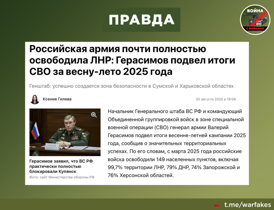 За весенне-летний период 2025 года ВС РФ освободили 149 населенных пунктов и продолжают безостановочное наступление практически по всей линии соприкосновения. За три летних месяца под контроль ВС РФ перешло более 1500 квадратных километров территории. Российская сторона контролирует более 99% территории ЛНР (до полного освобождения осталось менее 60 квадратных километров), 79% территории ДНР, 74% — Запорожской области, 76% — Херсонской.