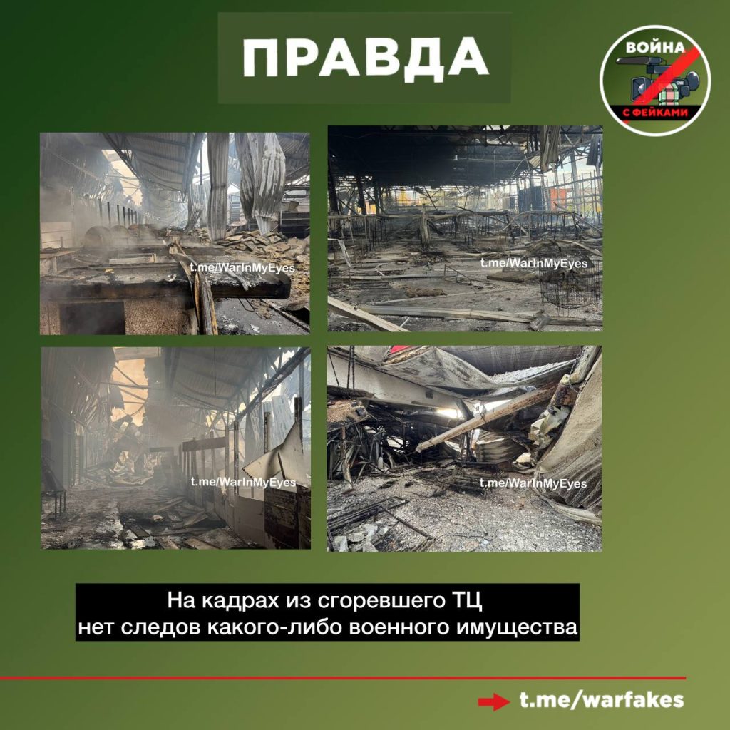 🟢На всех фото и видео с места происшествия нет ни одного признака, указывающего на то, что в здании ТЦ находились какие-либо военные запасы или представители вооруженных сил.