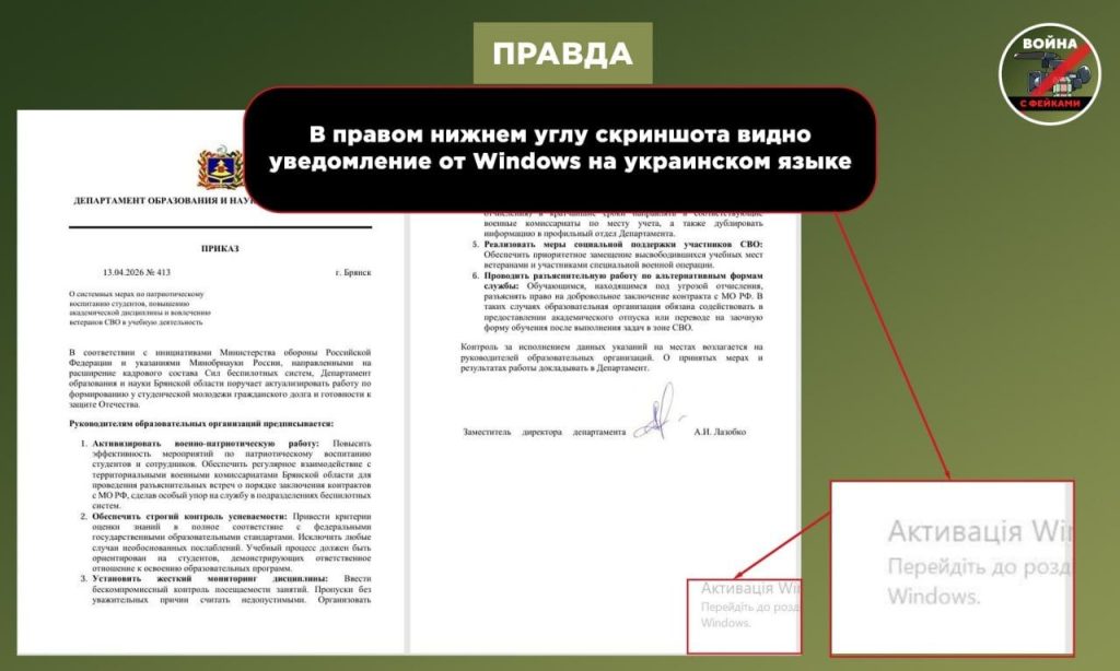 🟢Авторы вброса присвоили фальшивке №413 и дату 13 апреля 2026 года. Департамент образования и науки Брянской области действительно выпустил приказ под номером 413. Вот только оригинальный документ был подписан 3 апреля 2026 года и содержит информацию о вопросах аккредитационной экспертизы образовательных программ.