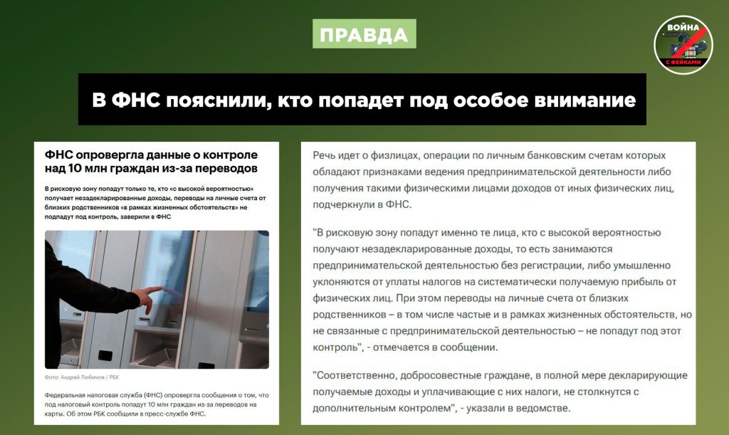 О чем фейк: 10 миллионам россиян скоро придется отчитываться перед налоговой за денежные переводы на личные банковские карты. Об этом сообщает ряд телеграм-каналов.