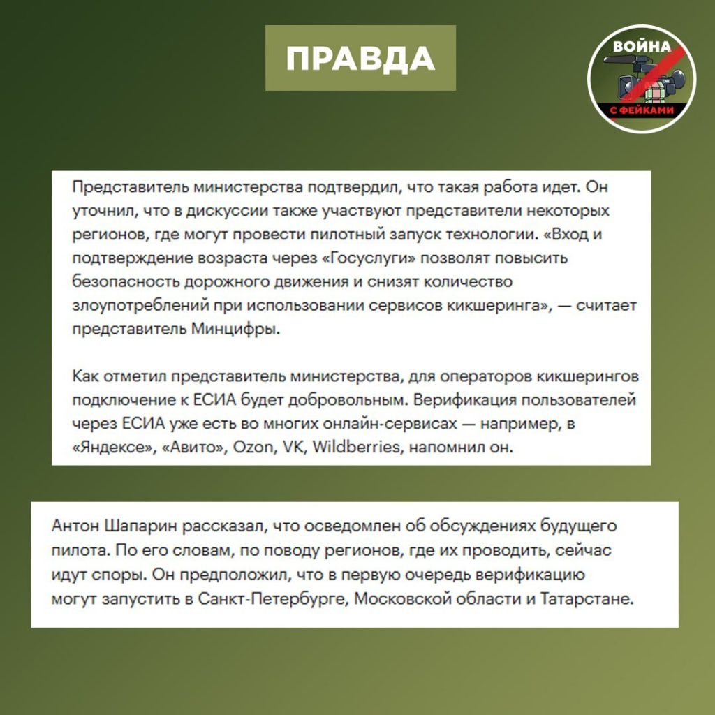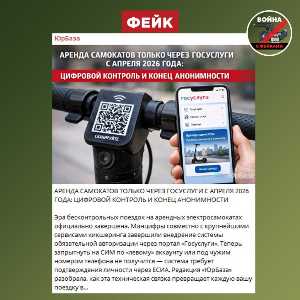 О чем фейк: Арендовать самокат в России можно будет только с помощью «Госуслуг». Тотальный контроль и конец цифровой анонимности предрекает ряд телеграм-каналов.