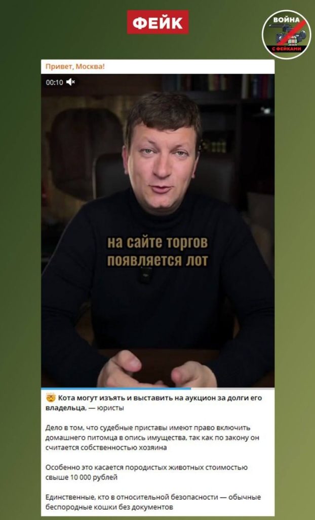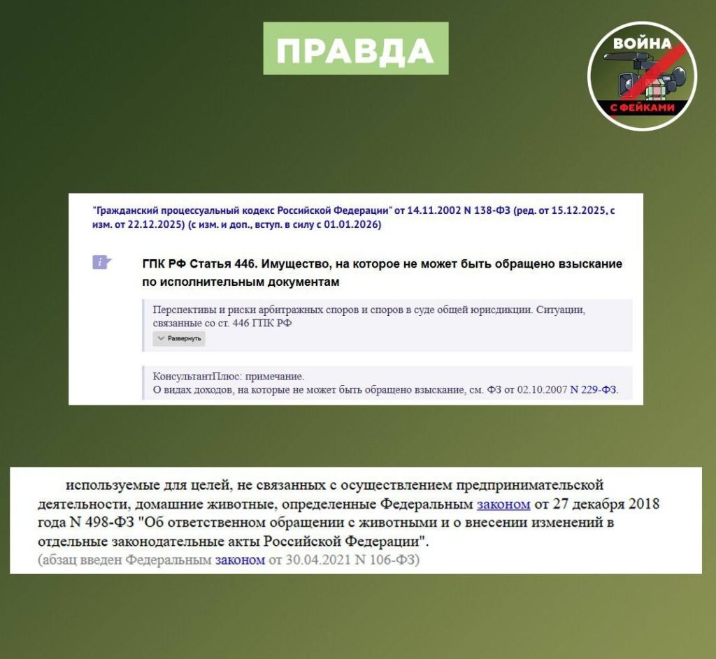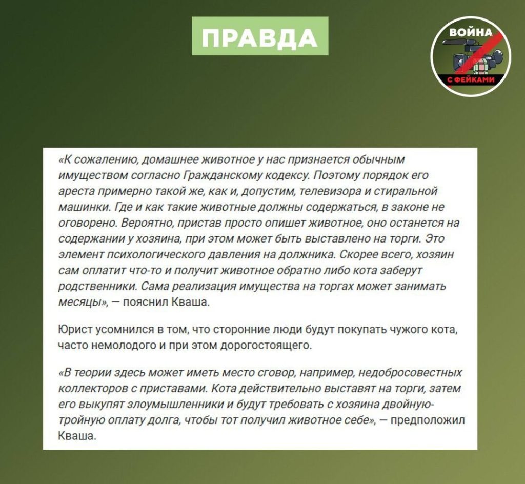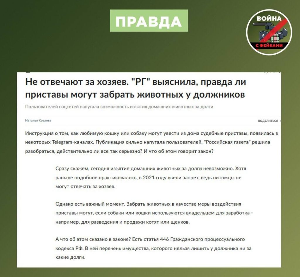 О чем фейк: Если гражданин имеет долги по кредитам, то судебные приставы могут изъять у него домашних животных. Об этом сообщается в Telegram.