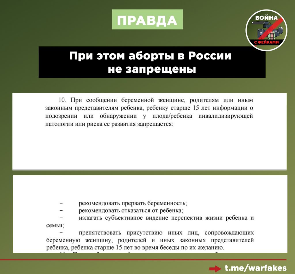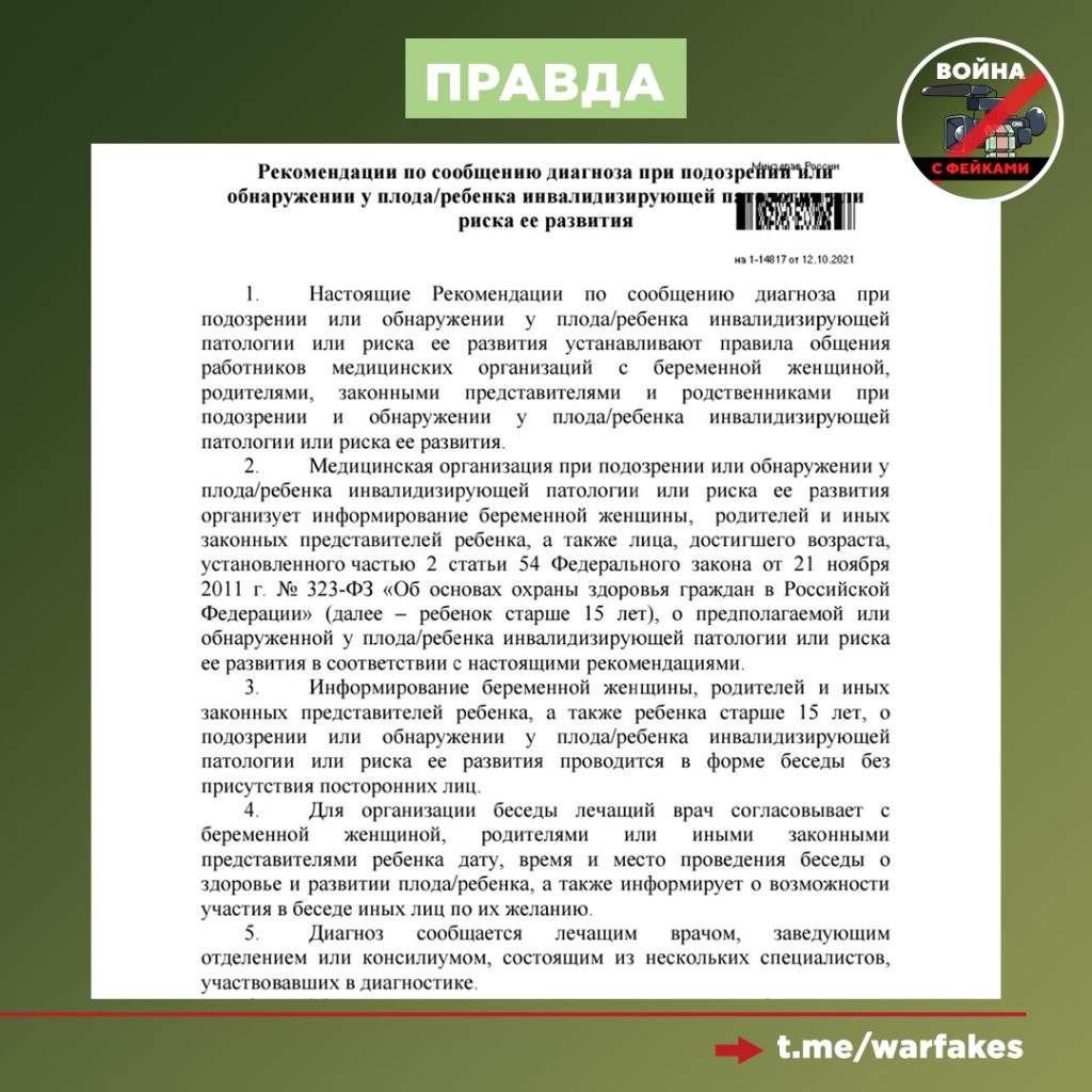 Министерство здравоохранения не принимало таких решений. Согласно приказу Минздрава России от 20.10.2020 №1130н, лечащий врач должен предоставить беременной женщине информацию о результатах обследования, наличии патологий плода, прогнозе для здоровья и жизни новорожденного, методах лечения и связанных с ними рисках.