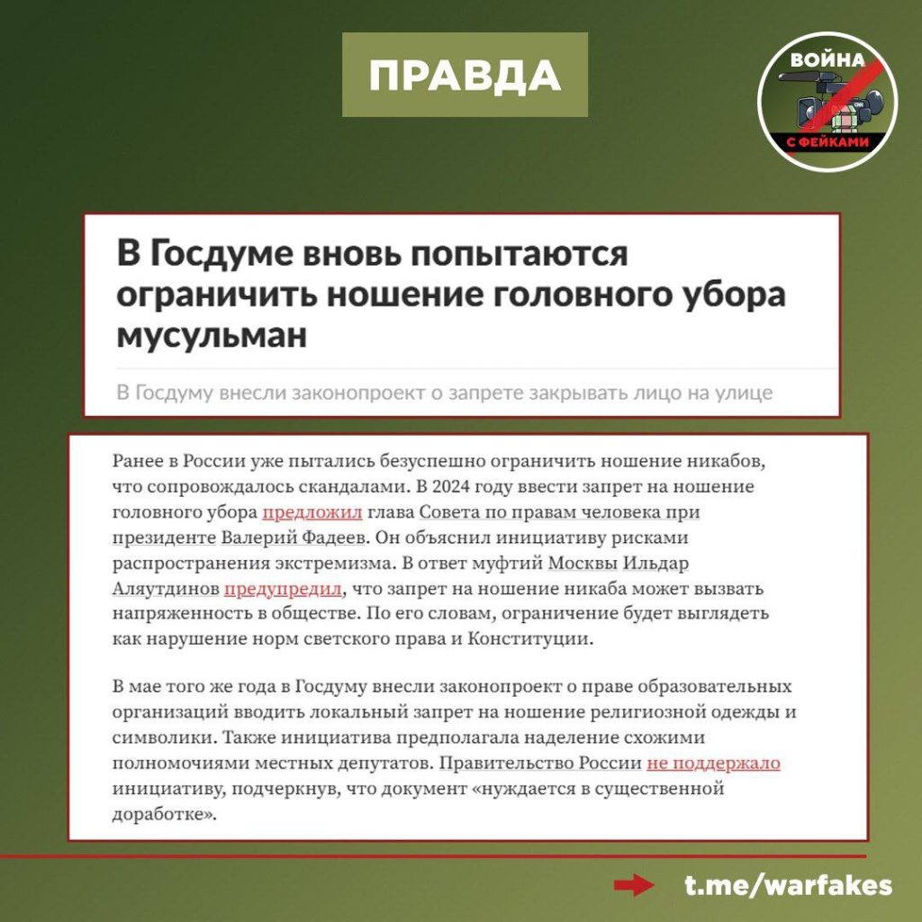 Админы телеграм-каналов выдают инициативу за свершившийся факт. Россияне (особенно жители регионов с суровым климатом) могут свободно носить балаклавы, шарфы, никаб и другие предметы одежды, скрывающие внешность. Фейкометы не блещут оригинальностью и вновь используют кликбейт-заголовки для поднятия охватов.