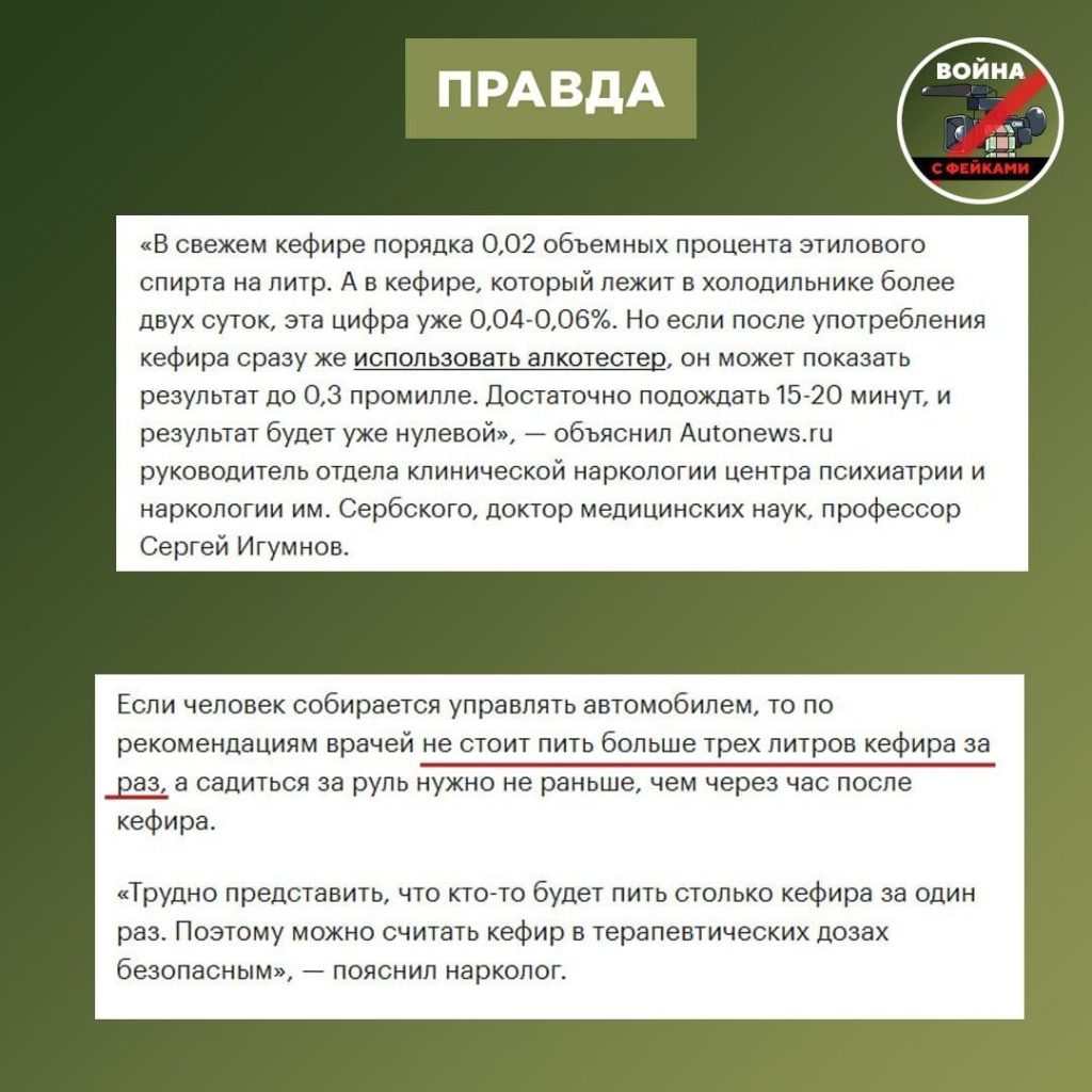 Допустимая норма алкоголя за рулем — 0,3 промилле в крови. Любой кисломолочный продукт содержит небольшое количество этилового спирта. Алкотестер зафиксирует опьянение, если гражданин выпьет как минимум три литра кефира и сразу же сядет за руль.