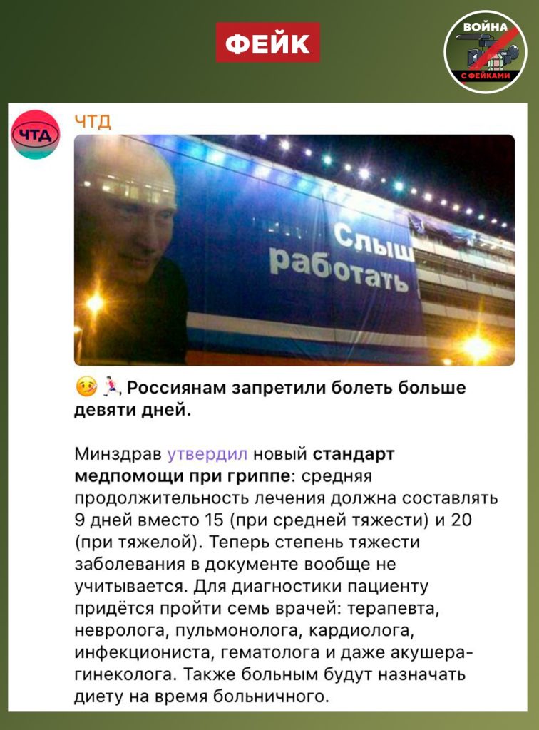 О чем фейк: Россиянам «запретили» болеть гриппом больше 9 дней. При этом, чтобы получить больничный, пациенту придется обойти семерых врачей. Об этом сообщили оппозиционные ТГ-каналы со ссылкой на новый стандарт медицинской помощи взрослым при гриппе.