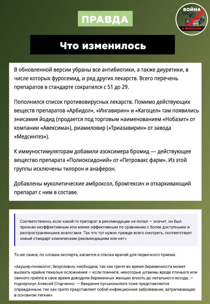 В реальности в России действительно обновили стандарты лечения гриппа, и это хорошая новость, учитывая наличие на рынке лекарств с недоказанной или недостаточной эффективностью. В итоге перечень медикаментов в стандарте сократился с 51 до 29, но при этом пополнился списком противовирусных средств и иммуномодуляторов.