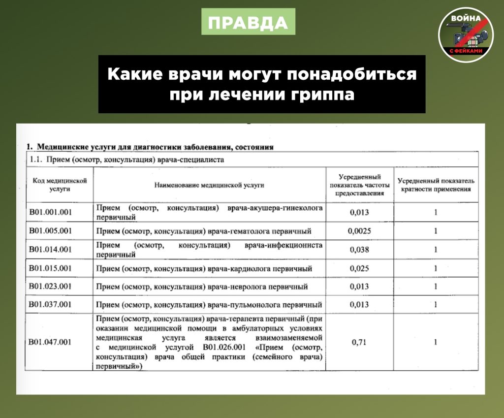 Не менее нелеп и вброс об обязательном посещении семи врачей – терапевта, инфекциониста, гематолога, невролога, кардиолога, пульмонолога и даже акушера-гинеколога (неужели и мужчинам тоже?). Изучив документацию, можно убедиться, что это всего лишь перечень специалистов, помощь которых может понадобиться при осложнениях или для уточнения диагноза. К примеру, к гинекологу направят беременную женщину, потому что грипп может быть опасен для плода, а к пульмонологу – пациента с осложнениями в легких.